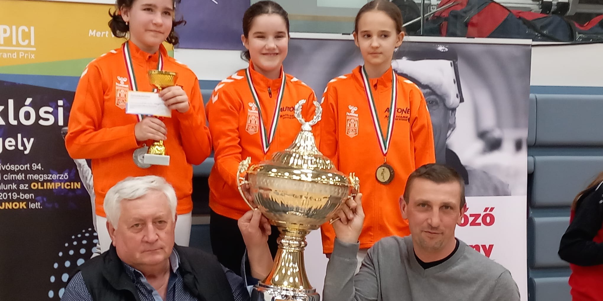 Az U13-as korosztályos lányverseny dobogósai, narancssárga melegítőben a szatmáriak